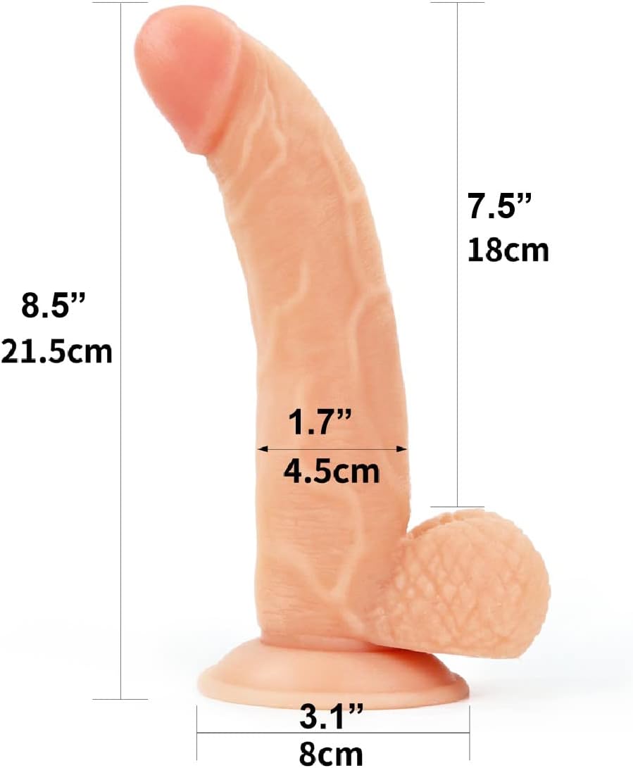 Realistic: Thick dildo made of body-safe TPE material with a strong suction cup for hands-free or pegging play, lifelike shaft and vein design. Soft dildo comes with 8.5 inches in total length, 7 inches in insertable length, 1.7 inches in diameter.